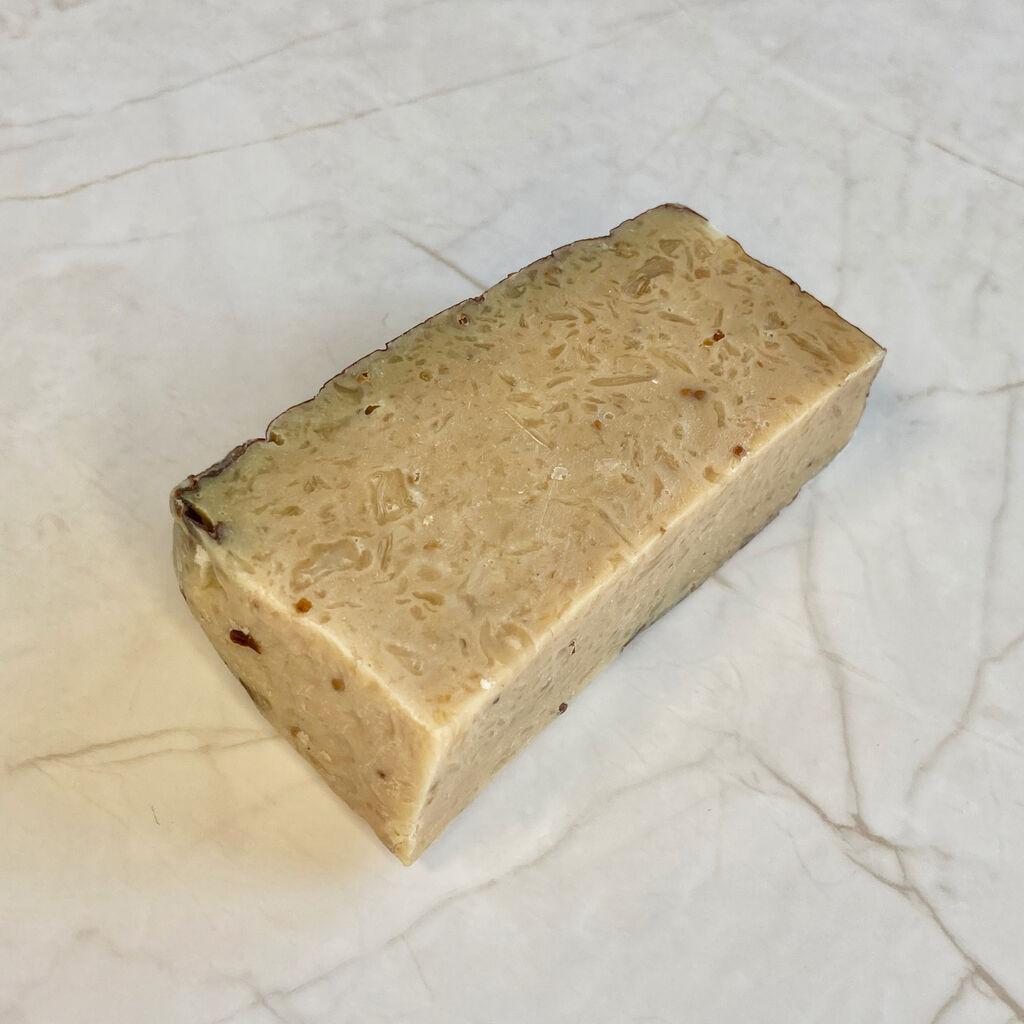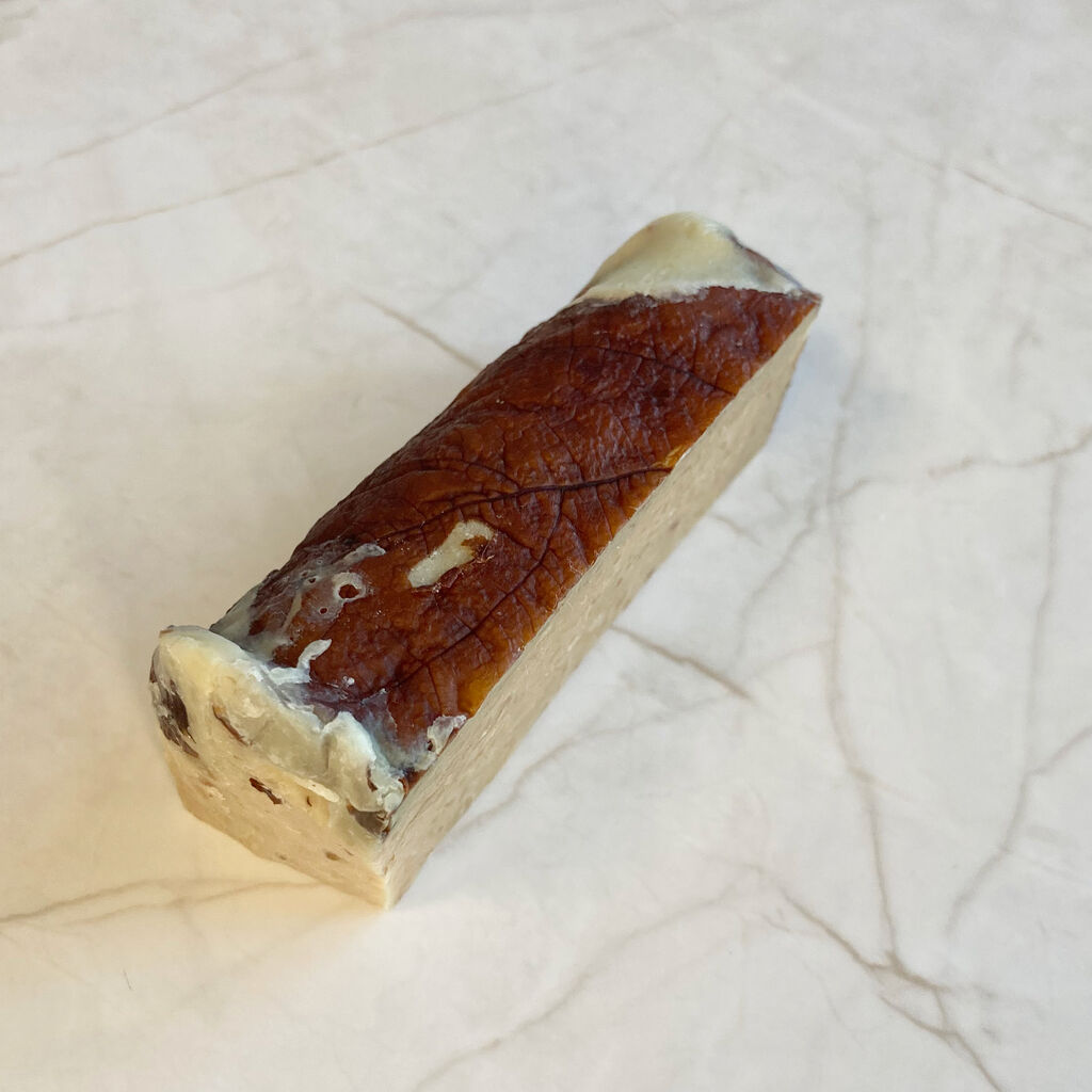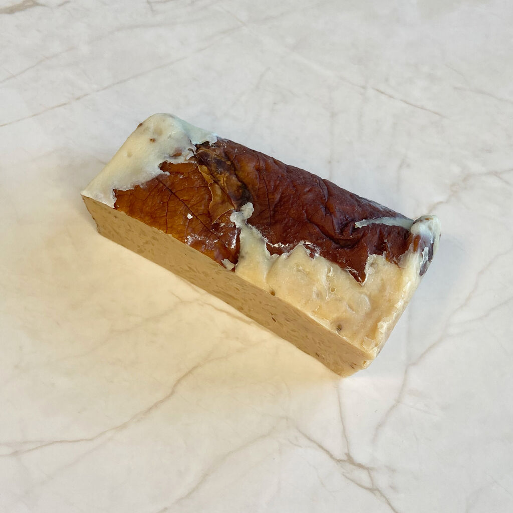 そんで、せっけんの中にいちじくも練り込まれてるんです。ちょっと今回は購入した量が少なかったので写真ではわかりにくいかもなんですが、いちじくの種のつぶつぶや果肉が見えるぐらいにいっぱい入ってる。こういうクリームチーズありそう。