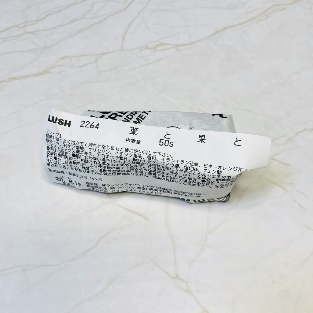 理由はもちろん、このせっけんのアピールポイントである葉っぱと果肉のせい!!!普通に使ったら洗面器の排水溝すぐ詰まるよ!!(LUSHの公式通販のレビューでも書かれてる)